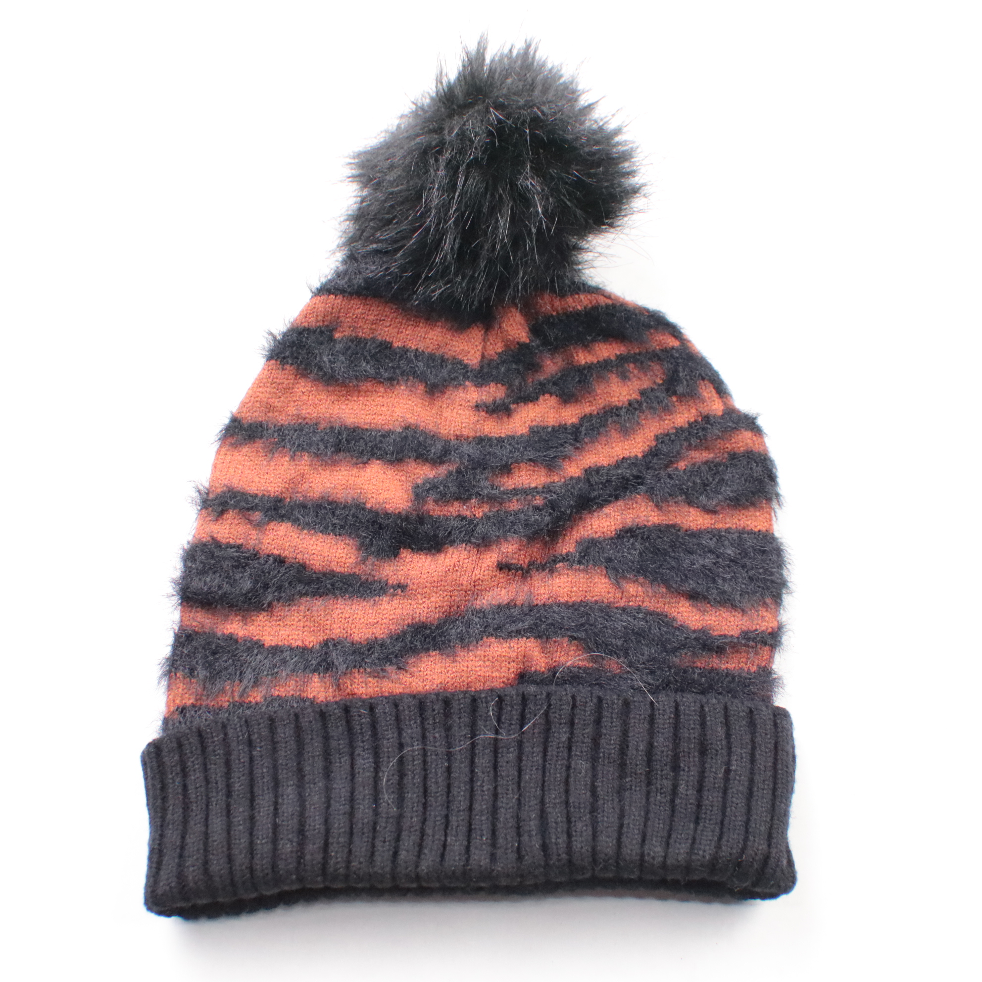 Вязаная шапка Primark с помпоном и полосатым фактурным узором. Подойдёт для прогулок и повседневной носки в холодную погоду. Широкий отворот лучше держит тепло и защищает уши от ветра.