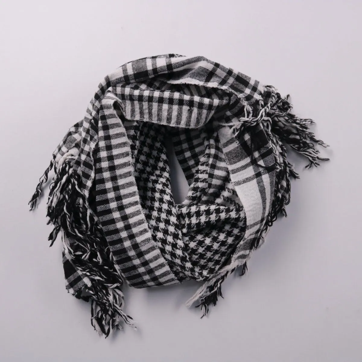 Шарф в чёрно-белую клетку с кисточками по краям. Подойдёт для повседневных образов и в прохладную погоду, легко сочетается с верхней одеждой благодаря нейтральной гамме.