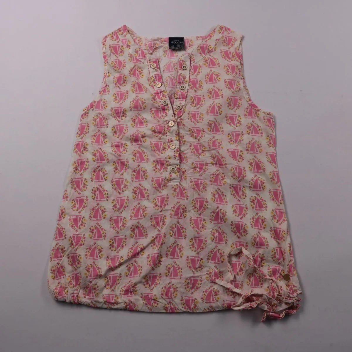 Летняя блузка Hooch без рукавов, белая с розово-жёлтым принтом и застёжкой на пуговицы спереди. Подойдёт для повседневной носки и прогулок в тёплую погоду. Лёгкая ткань и регулируемый низ на завязках делают посадку более удобной.
