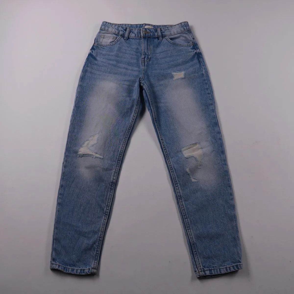 Джинсы F&F из светлого денима с эффектом потертостей и декоративными разрывами. Подойдут для повседневной носки и прогулок, хорошо сочетаются с футболками и худи. Плотная джинса ноская и удобна в уходе.