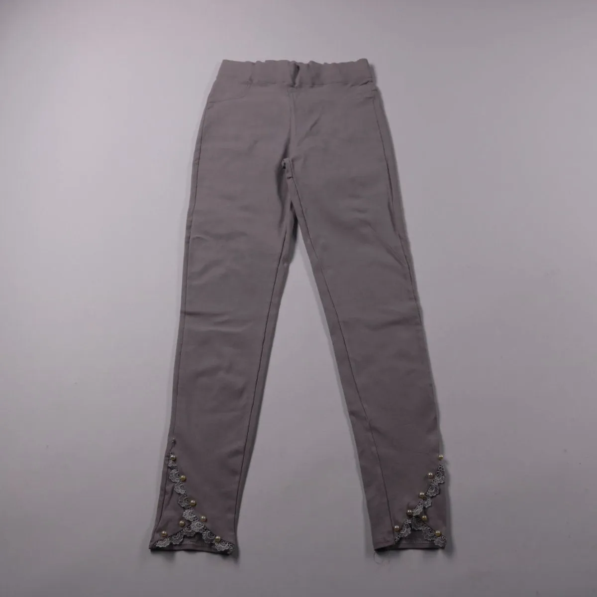 Легинсы для девочки из плотного трикотажа с высокой посадкой и эластичным поясом. Внизу по щиколоткам есть отделка кружевом и декоративными бусинами — подойдут для повседневных образов и на праздник. Тянущийся материал хорошо садится по фигуре и не стесняет движений.