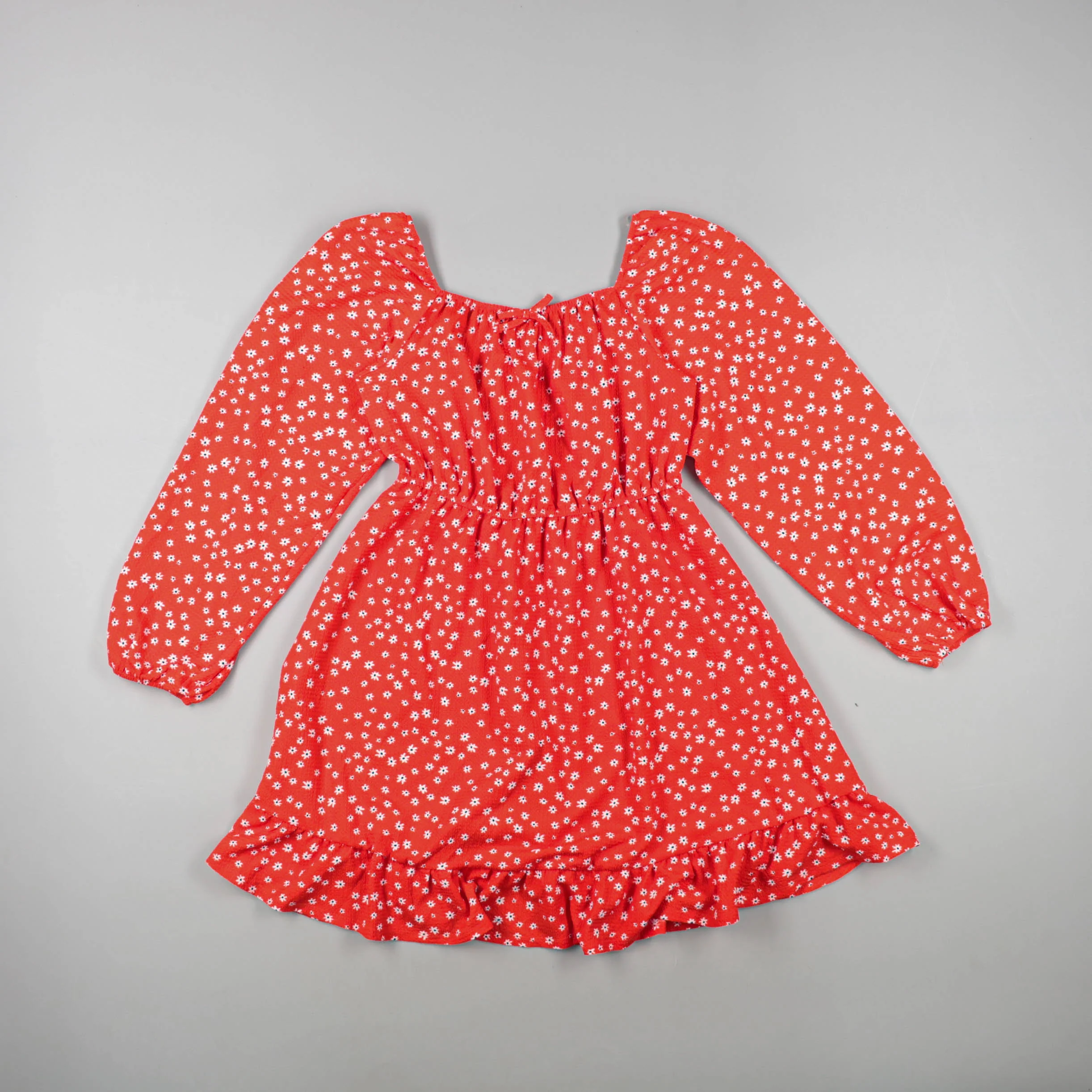 Детское платье для девочки красного цвета с мелким цветочным принтом, длинными рукавами и рюшей по низу. Подойдёт для садика, прогулок и повседневной носки в тёплую весну/осень или прохладное лето. Эластичная талия делает посадку комфортной и не сковыв...