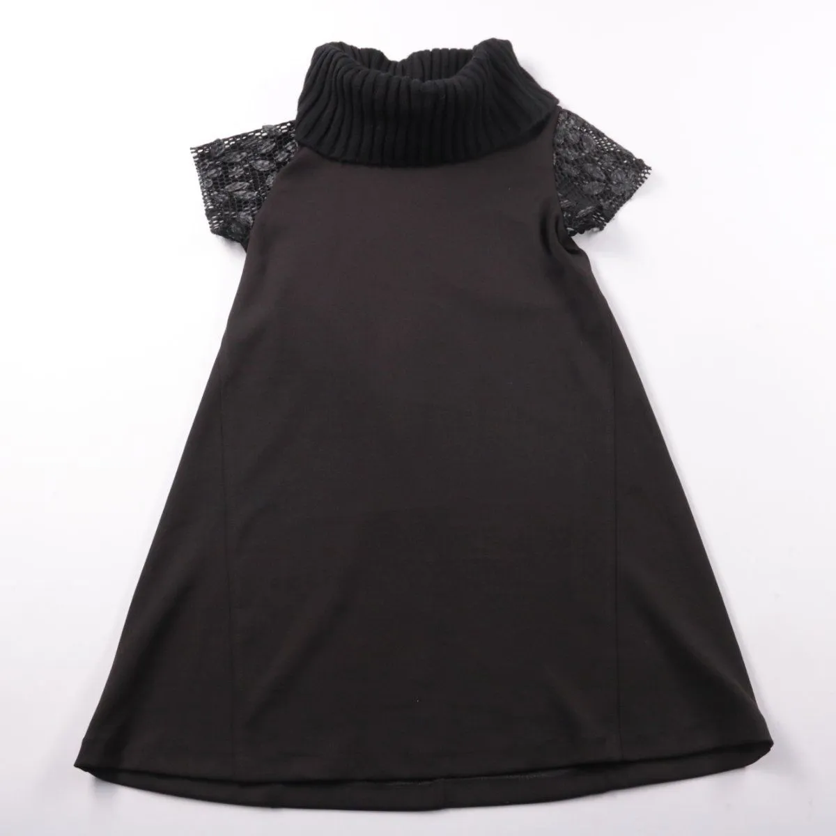 Платье Everis чёрного цвета с высоким трикотажным воротником и кружевными рукавами-крылышками. Подойдёт для праздников, утренников и школьных мероприятий. Практичный материал почти не мнётся и удобно садится за счёт эластана.