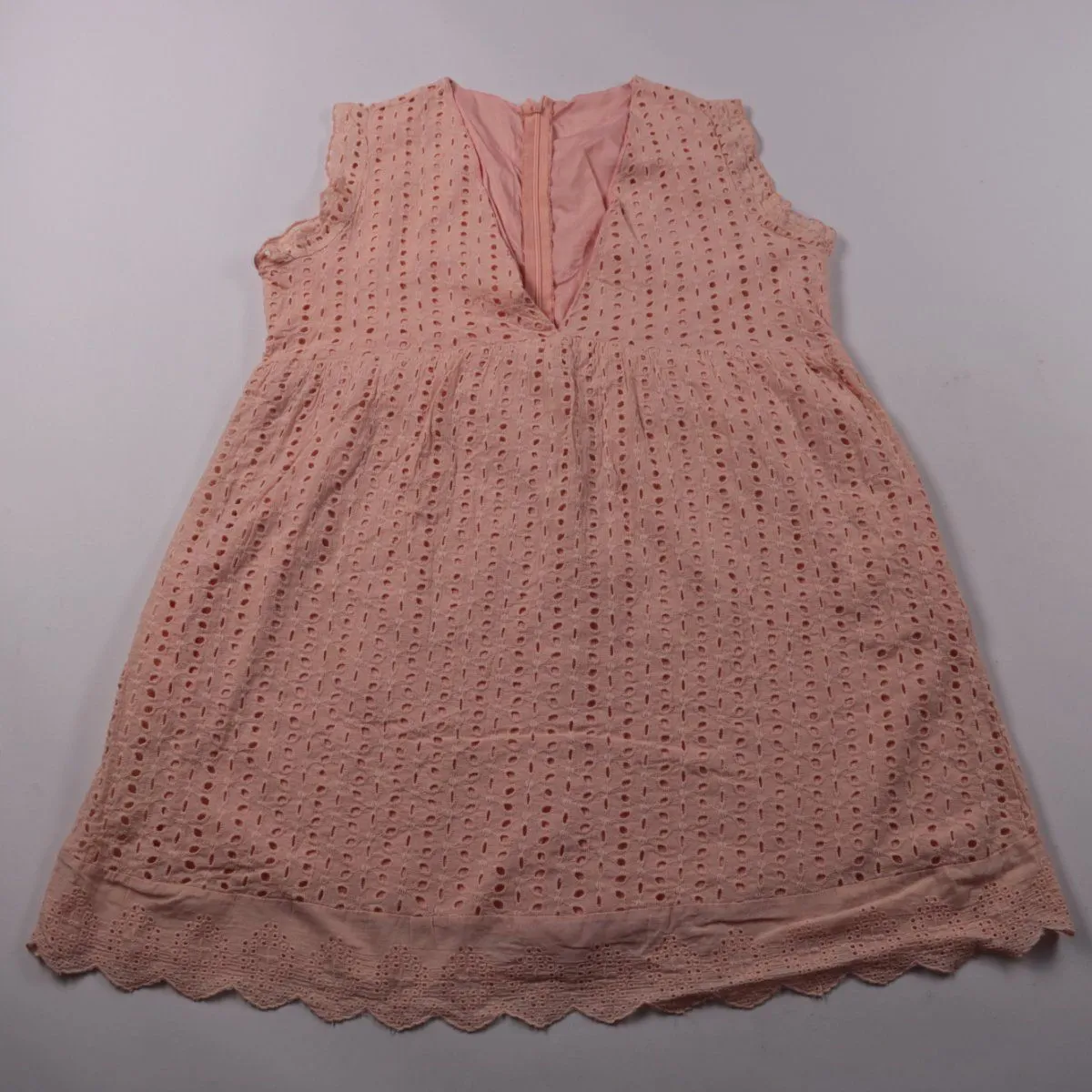 Детское платье без рукавов из розовой ткани с ажурной вышивкой (прошва) и фигурным краем по низу. Подойдёт для тёплой погоды, праздников и прогулок, застёгивается на молнию сзади. Лёгкое и хорошо пропускает воздух.