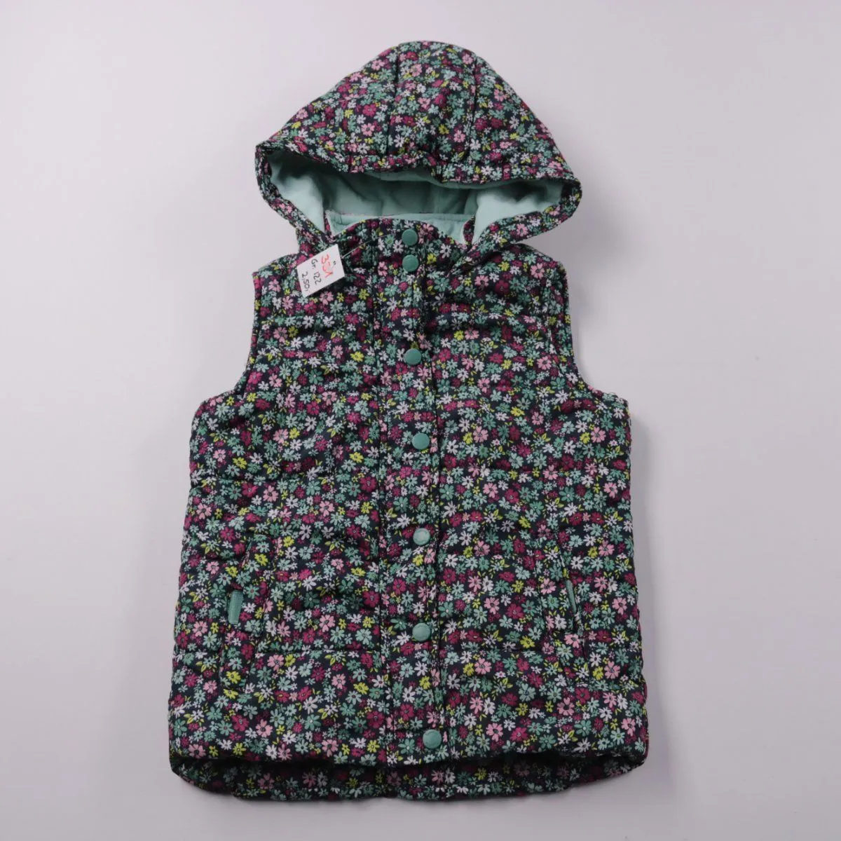 Стёганый жилет Topolino с капюшоном и цветочным принтом. Подойдёт для прогулок весной и осенью, удобно носить поверх худи или свитера. Лёгкий утеплитель сохраняет тепло и не стесняет движений.