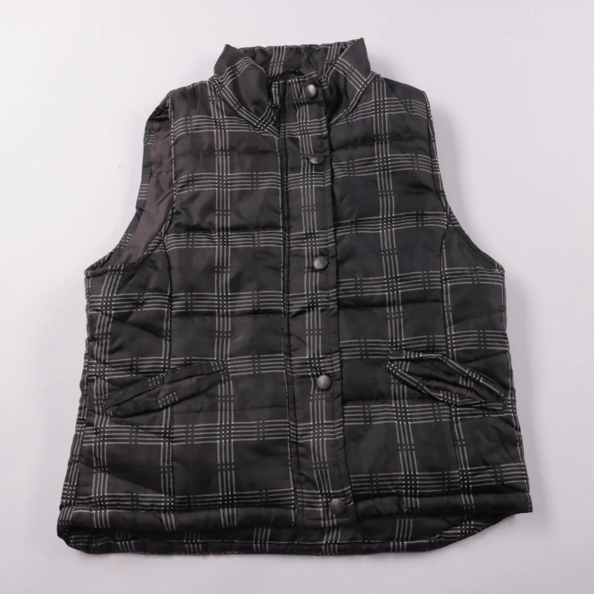 Стёганый жилет ZAB для девочки в чёрном цвете с клетчатым принтом, с воротником-стойкой и застёжкой на кнопки. Подойдёт для прохладной весны/осени и для школы, удобно надевать поверх худи или свитера. Лёгкий и не сковывает движения, есть карманы.