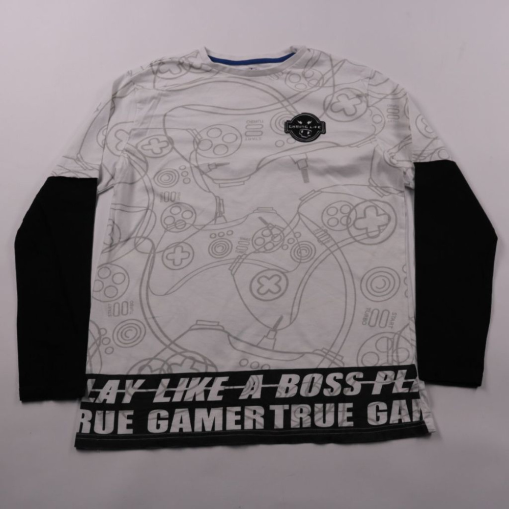 Лонгслив F&F белого цвета с чёрными рукавами и принтом с геймпадами и надписью внизу. Подойдёт для повседневной носки в школу или на прогулки, особенно для любителей игр. Практичен тем, что длинный рукав удобен в прохладную погоду и легко сочетать с дж...