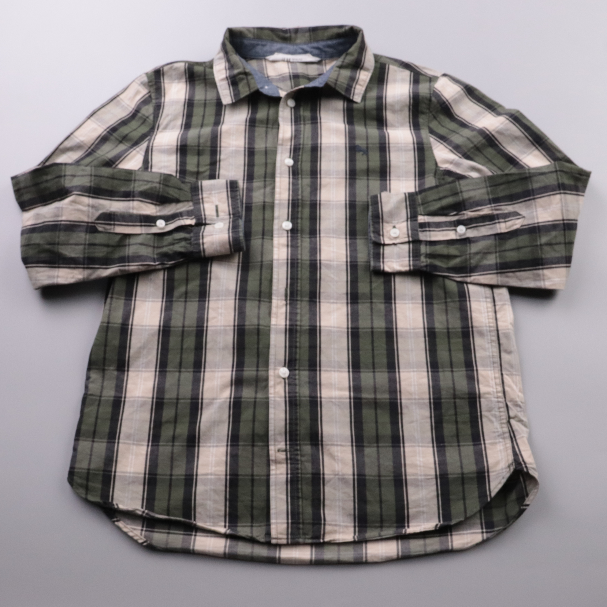 Рубашка H&M в клетку, зелёно-бежевого цвета, на пуговицах и с длинным рукавом. Подойдёт для школы, прогулок и повседневной носки в любое время года как самостоятельный верх или как слой. Натуральный хлопок хорошо дышит и комфортен в носке.