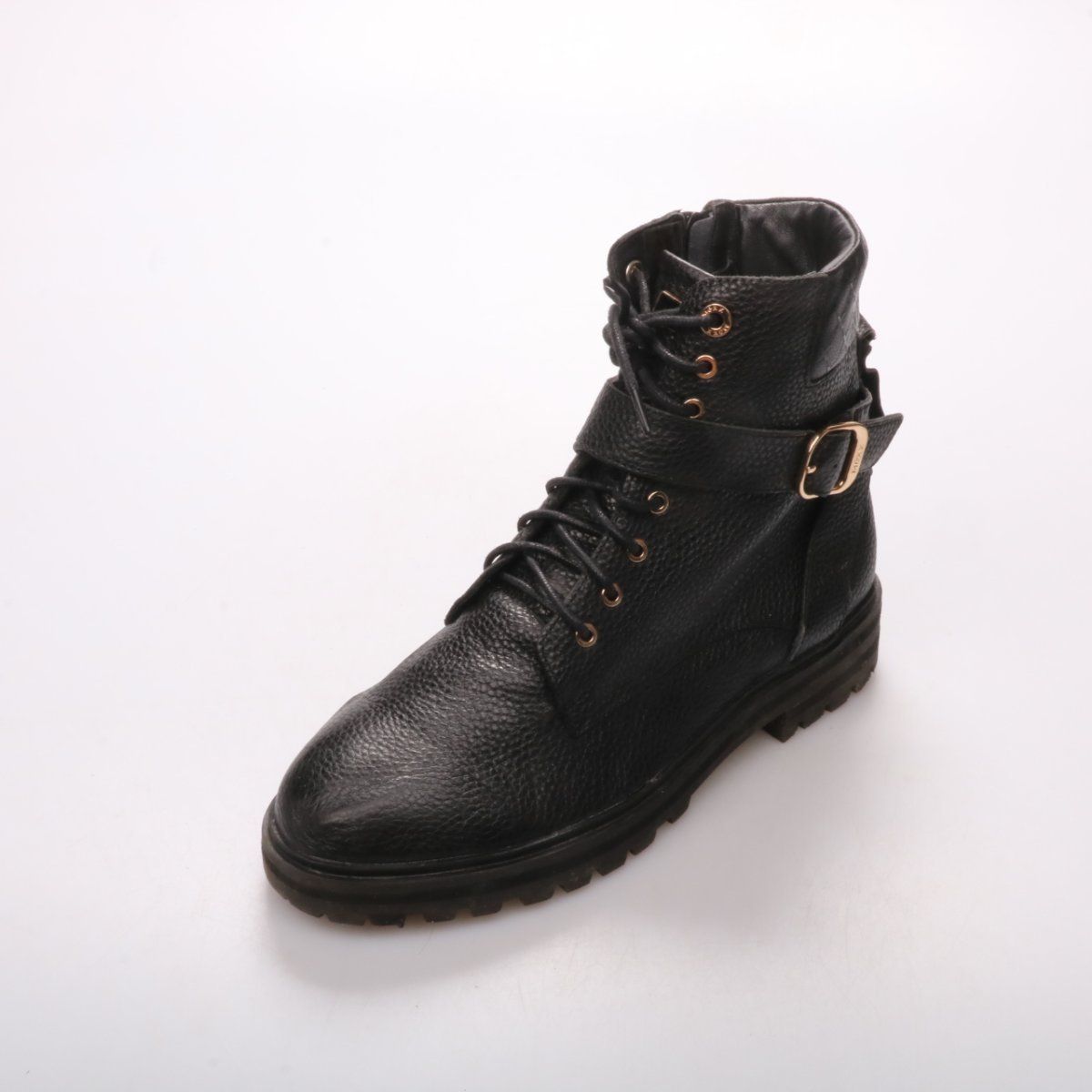 Мужские ботинки MGXX из чёрной фактурной кожи на шнуровке, с боковой молнией и ремешком на пряжке. Подойдут на каждый день в городе в межсезонье и прохладную погоду. Рельефная подошва даёт более уверенное сцепление на мокрых и скользких покрытиях.