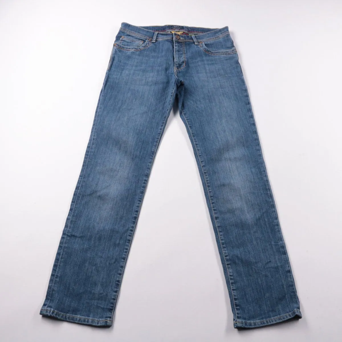 Мужские джинсы Bugatti (style Madrid) классического синего цвета с прямыми штанинами. Подойдут для повседневной носки и офиса в стиле casual, легко сочетаются с рубашками и футболками. Практичный деним хорошо держит форму и не требует сложного ухода.
