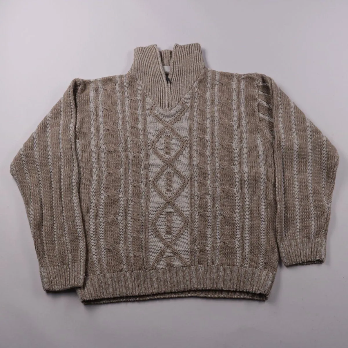 Мужской вязаный свитер Canda с высоким воротником на молнии и фактурной вязкой с косами и полосками. Подойдёт для прохладной погоды, повседневной носки и прогулок. Молния на воротнике позволяет удобно регулировать посадку и теплообмен.