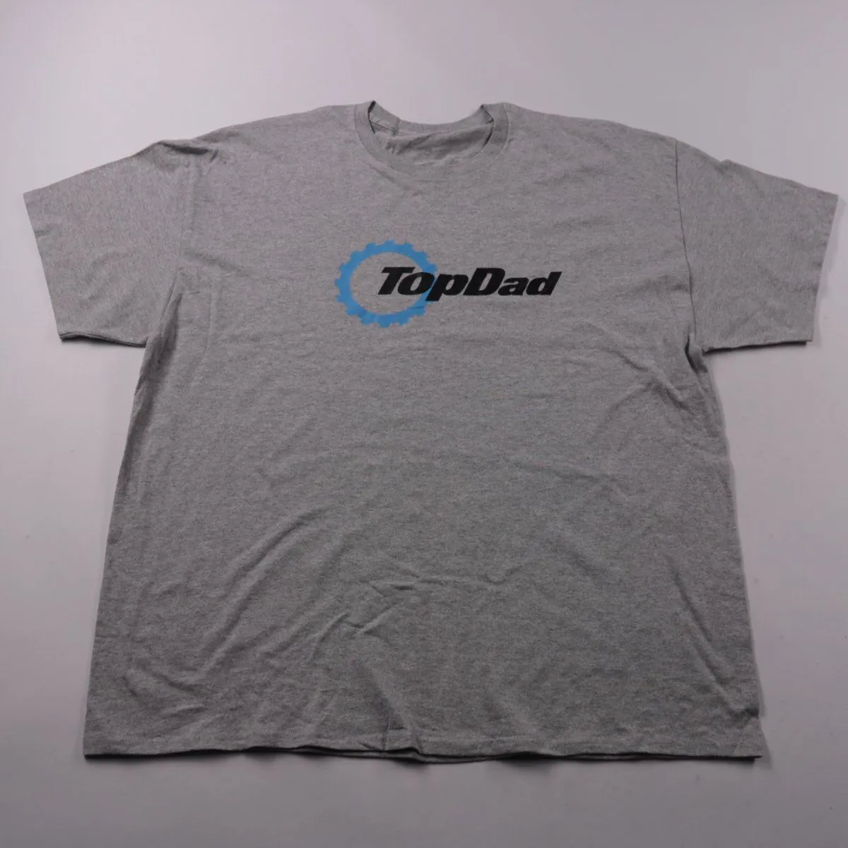 Мужская футболка с принтом TopDad на груди, серого меланжевого цвета. Подойдёт для повседневной носки и дома. Практична в уходе и легко сочетается с джинсами и спортивными брюками.