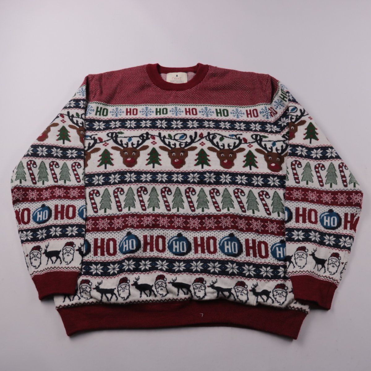Мужской свитер Next с новогодним жаккардовым рисунком (олени, ёлки, надписи). Подойдёт для зимних прогулок, праздников и уютных образов дома. Плотный трикотаж с манжетами и резинкой по низу хорошо держит форму.