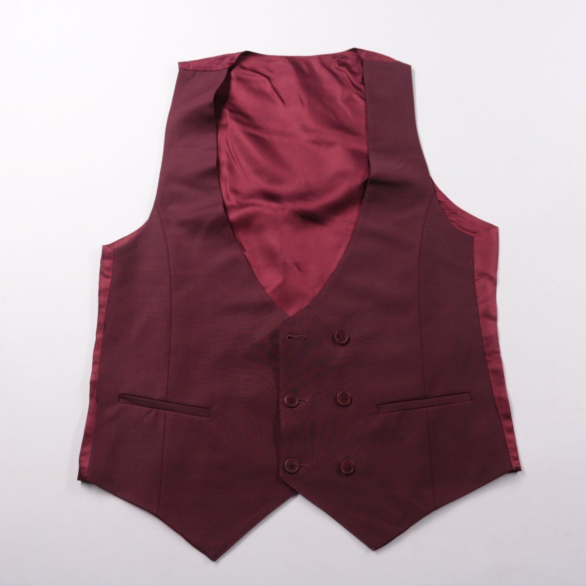 Мужской костюмный жилет Avclst бордового цвета, двубортный, с гладкой подкладкой и карманами в рамку. Подойдёт для деловых образов и торжественных случаев, хорошо сочетается с рубашкой и брюками. Ткань с высоким содержанием шерсти держит форму и выглядит аккуратно в носке.