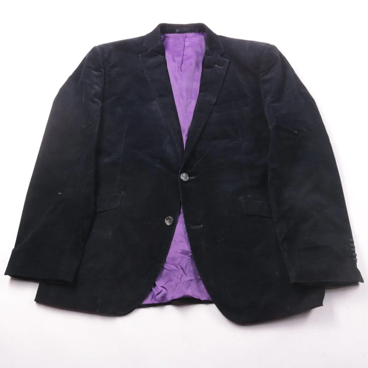 Мужской пиджак Linus черного цвета с фиолетовой подкладкой и застежкой на две пуговицы. Подойдет для офиса и мероприятий, хорошо сочетается с рубашками и брюками в классическом стиле. Практичный вариант за счет универсального цвета и карманов.