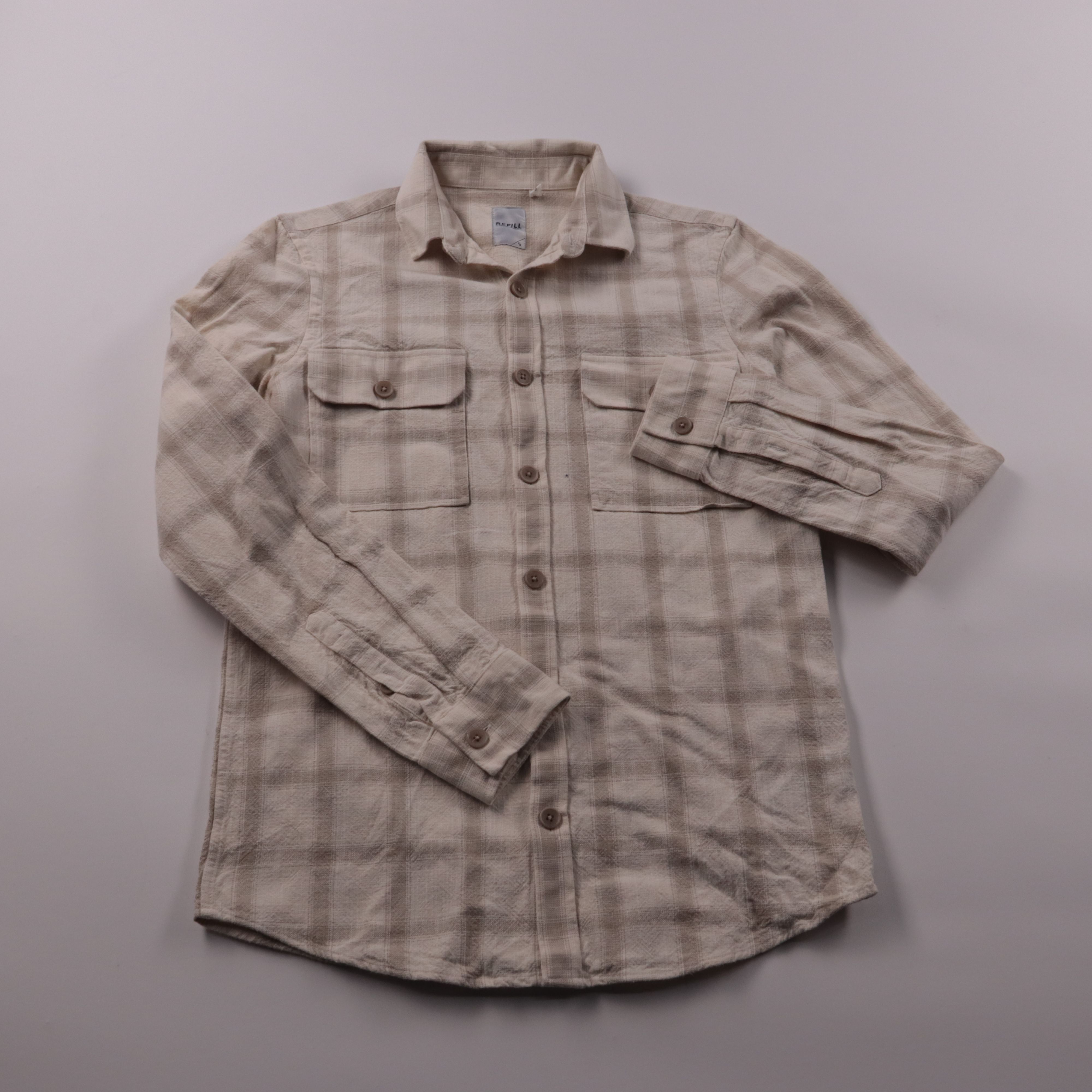 Мужская рубашка Refill в клетку, с длинным рукавом и двумя нагрудными карманами на пуговицах. Подойдёт для повседневных образов и как лёгкая верхняя рубашка в межсезонье. Натуральный хлопок хорошо дышит и комфортен в носке.