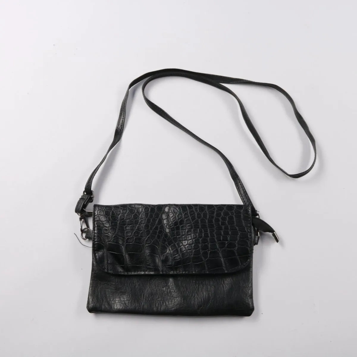 Небольшая чёрная сумка через плечо с клапаном и тиснением под крокодила. Подойдёт для повседневных выходов и поездок, когда нужно взять только самое необходимое. Длинный ремешок освобождает руки и удобно носится на плече или кросс-боди.