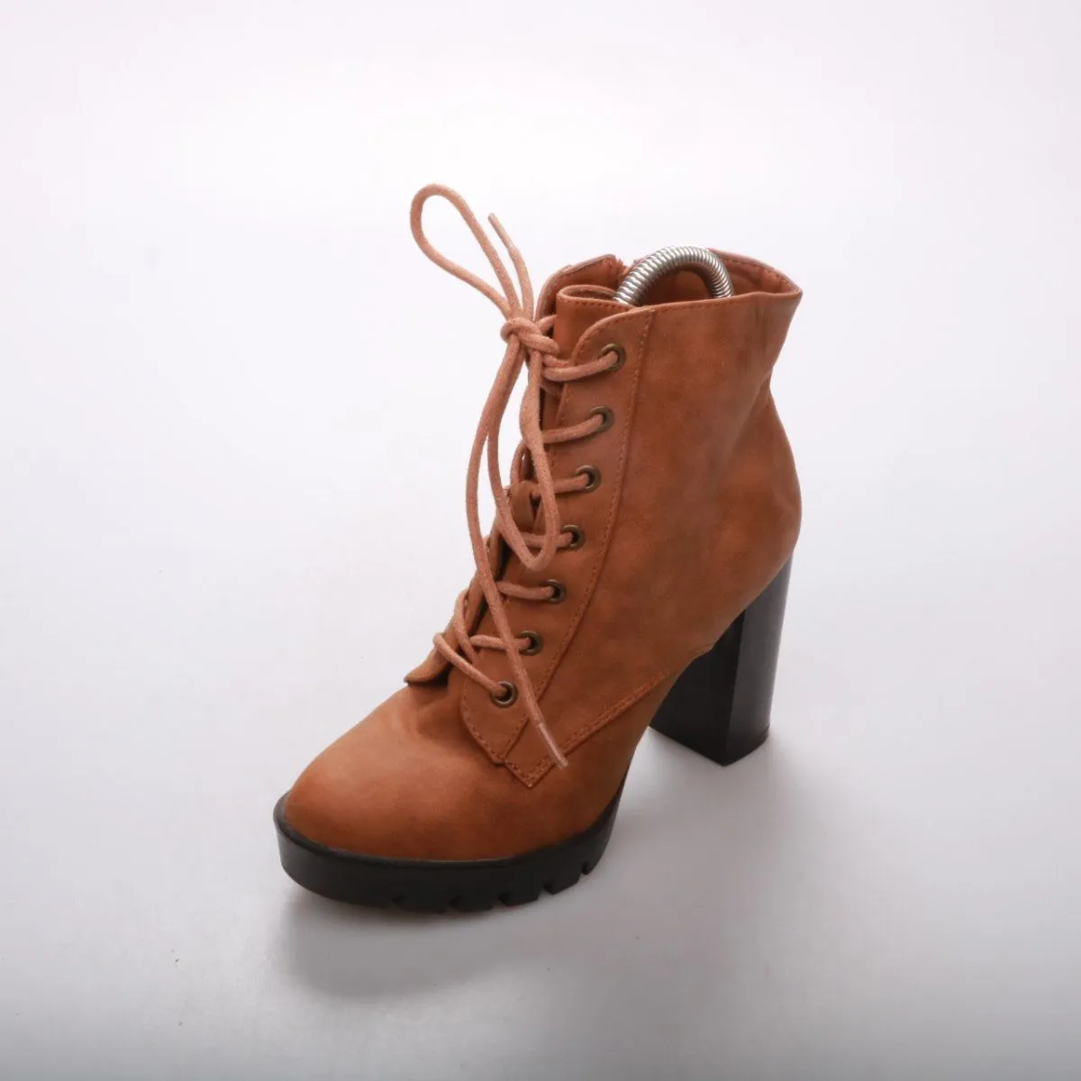 Женские ботильоны на устойчивом каблуке и шнуровке, выполнены под замшу в рыжем цвете. Подойдут для повседневных образов в демисезон, удобно регулируются по подъёму и фиксируются молнией сбоку. Рельефная тракторная подошва даёт хорошее сцепление на мокрой дороге.