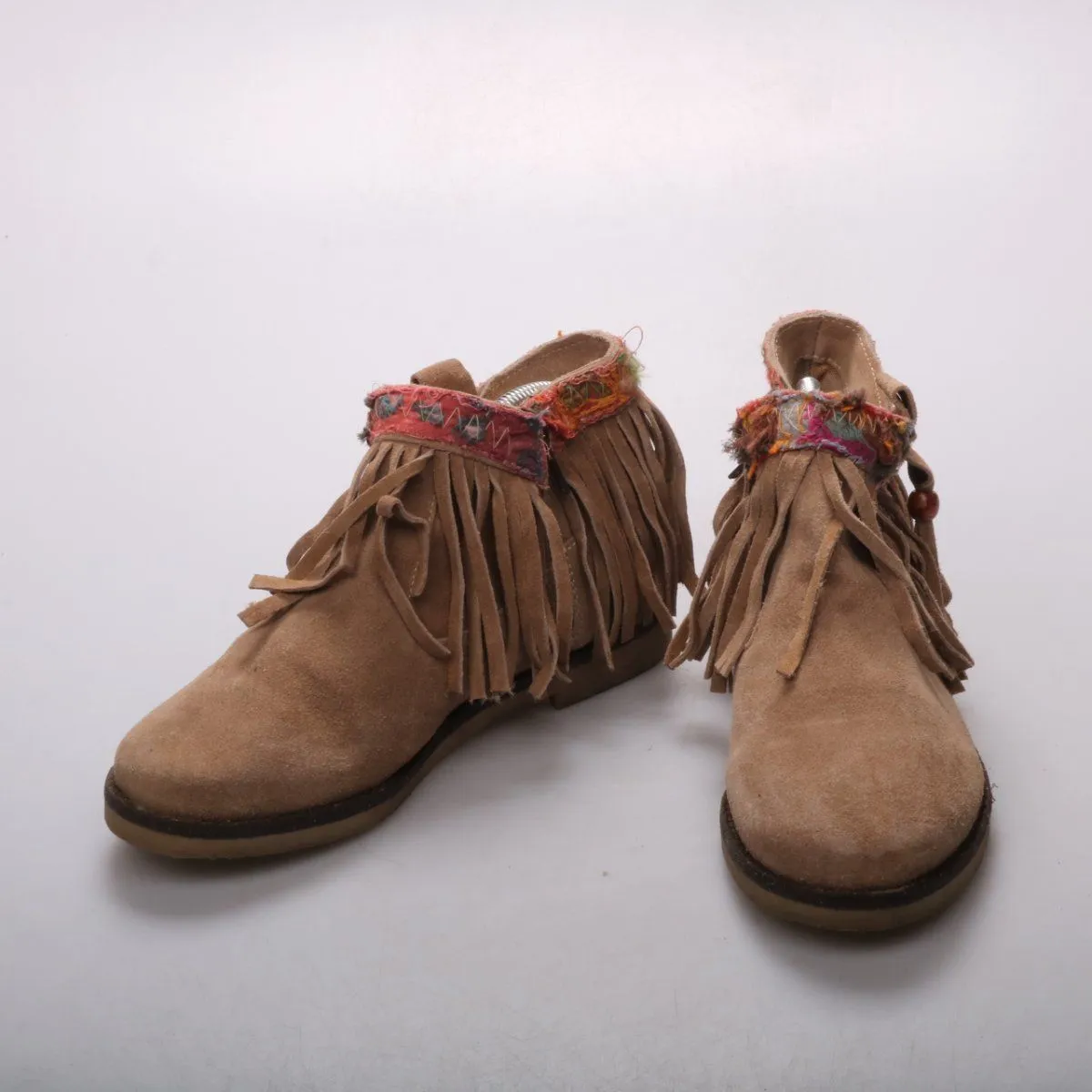 Женские ботильоны CafeNoir из натуральной замши бежевого оттенка с бахромой и декоративной текстильной окантовкой. Подойдут для повседневных образов в стиле бохо в межсезонье. Удобная плоская подошва делает их практичными для длительных прогулок.