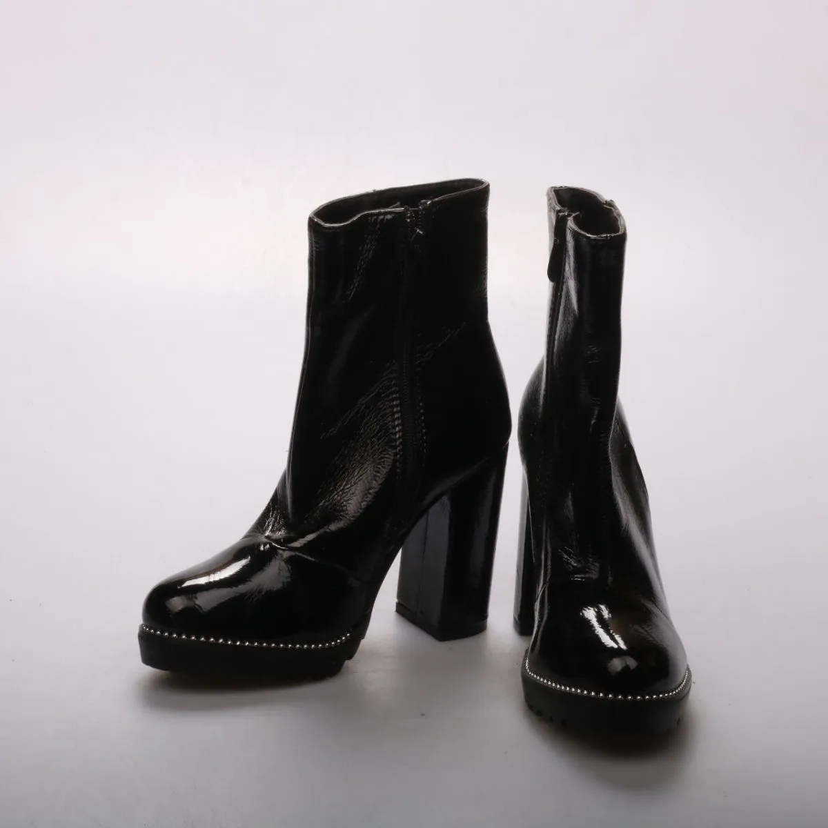 Женские ботильоны Diva-Tine из чёрной лаковой кожи на высоком устойчивом каблуке и платформе. Подойдут для повседневных и вечерних образов в прохладную погоду, есть боковая молния для удобного надевания. Рифлёная подошва помогает лучше держаться на поверхности.