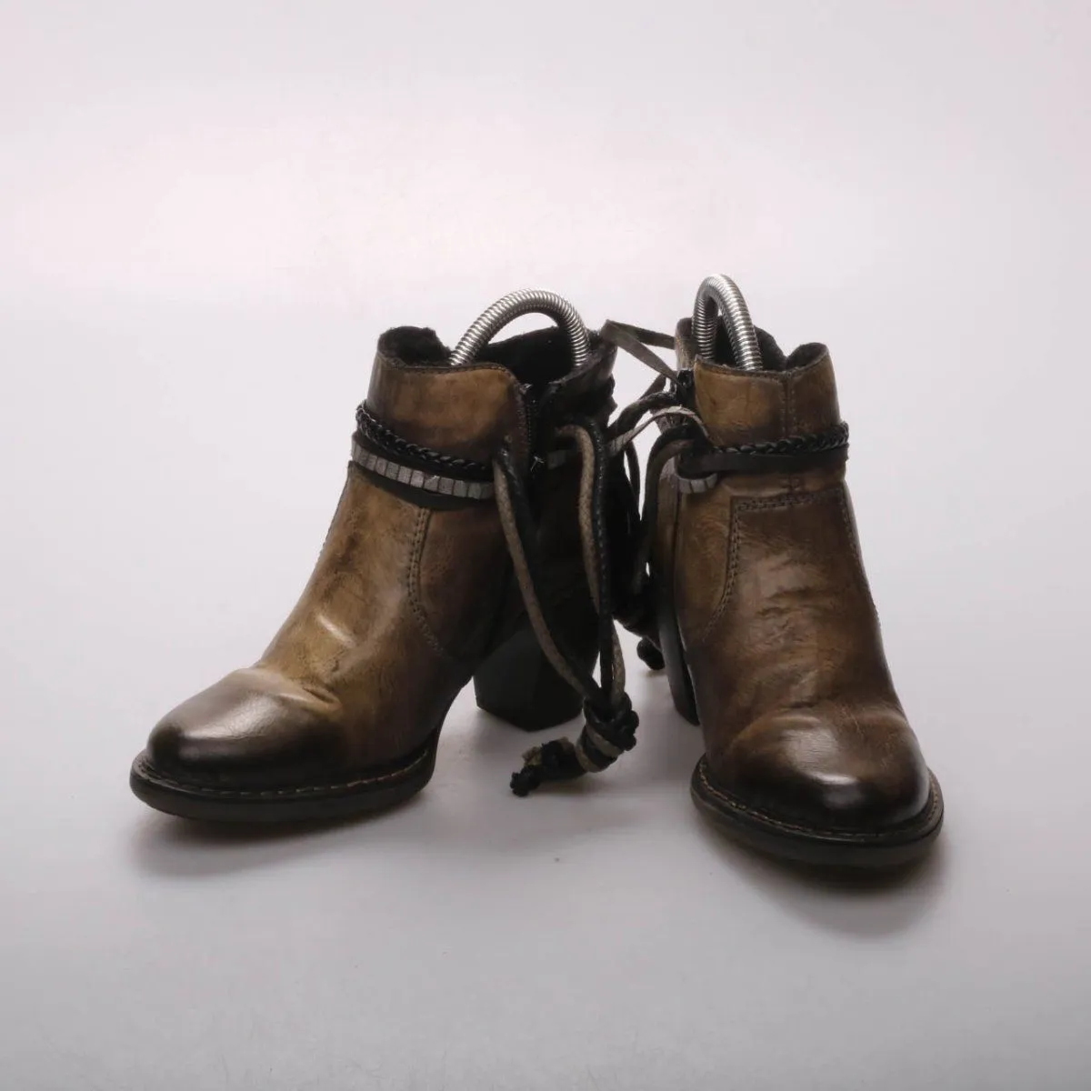 Женские кожаные ботильоны на устойчивом каблуке, с боковой молнией и декоративной шнуровкой вокруг щиколотки. Подойдут для повседневных образов в прохладную погоду, хорошо сочетаются с джинсами и платьями. Практичное преимущество — рельефная резиновая подошва для более уверенного сцепления.