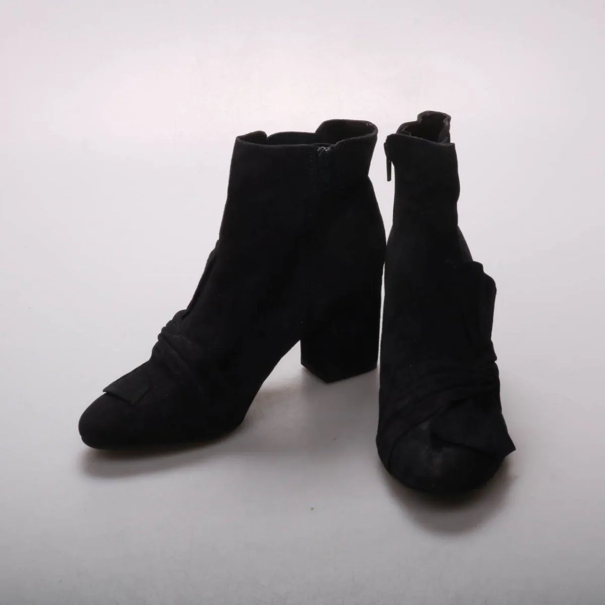 Женские ботильоны без бренда, чёрного цвета, на устойчивом каблуке с боковой молнией. Подойдут для повседневных образов в прохладную погоду и на выход. Удобно надевать и снимать за счёт застёжки-молнии.