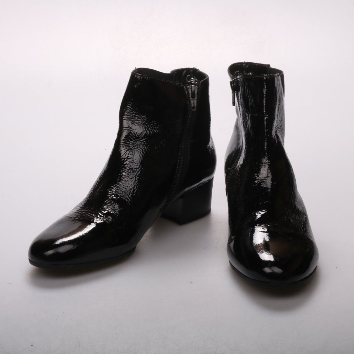 Женские ботильоны Gabor из чёрной лакированной кожи на устойчивом каблуке, с застёжкой-молнией сбоку. Подойдут для повседневных образов в межсезонье и на выход. Практичный плюс — гладкая лакированная поверхность легко очищается от загрязнений.