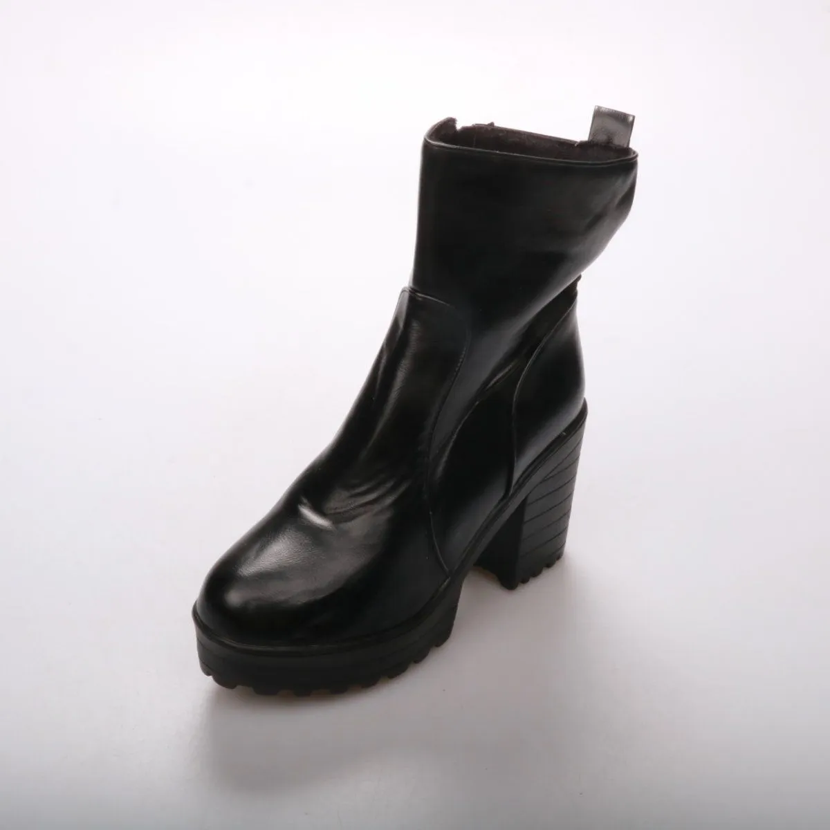 Женские ботильоны в чёрном цвете на устойчивом каблуке и платформе, застёжка на молнию сбоку. Подойдут для повседневной носки в городе осенью и весной, хорошо смотрятся с джинсами и платьями. Рифлёная подошва даёт лучшее сцепление на мокром асфальте.