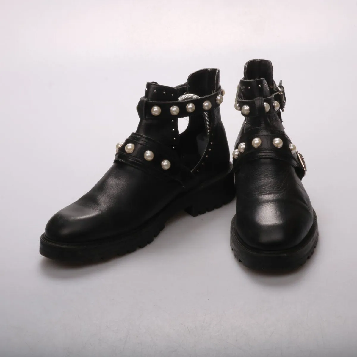 Женские ботинки Zara Basic из чёрной кожи с ремешками, пряжками и декоративными жемчужинами, с открытыми вставками по бокам. Подойдут на весну/осень и для городских образов в рок/кэжуал стиле. Плотная тракторная подошва даёт устойчивость и лучше держит сцепление.