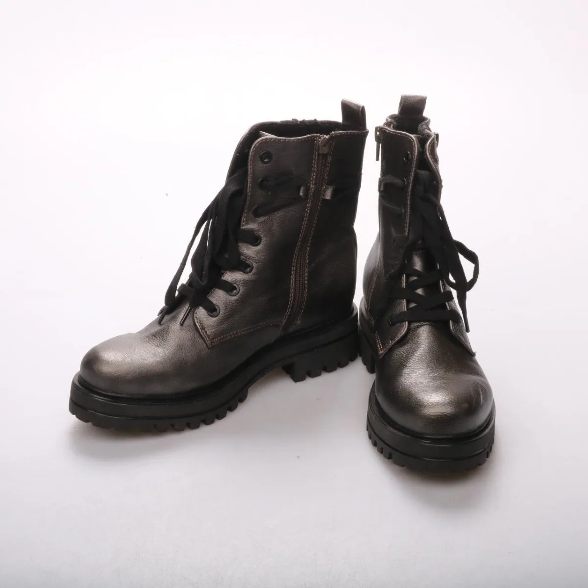 Женские ботинки на шнуровке с боковой молнией, бренд не указан. Подойдут для повседневной носки в прохладную погоду и на мокрых улицах благодаря высокой посадке и плотной фиксации. Практичное преимущество — массивная рифлёная подошва даёт хорошее сцепление.