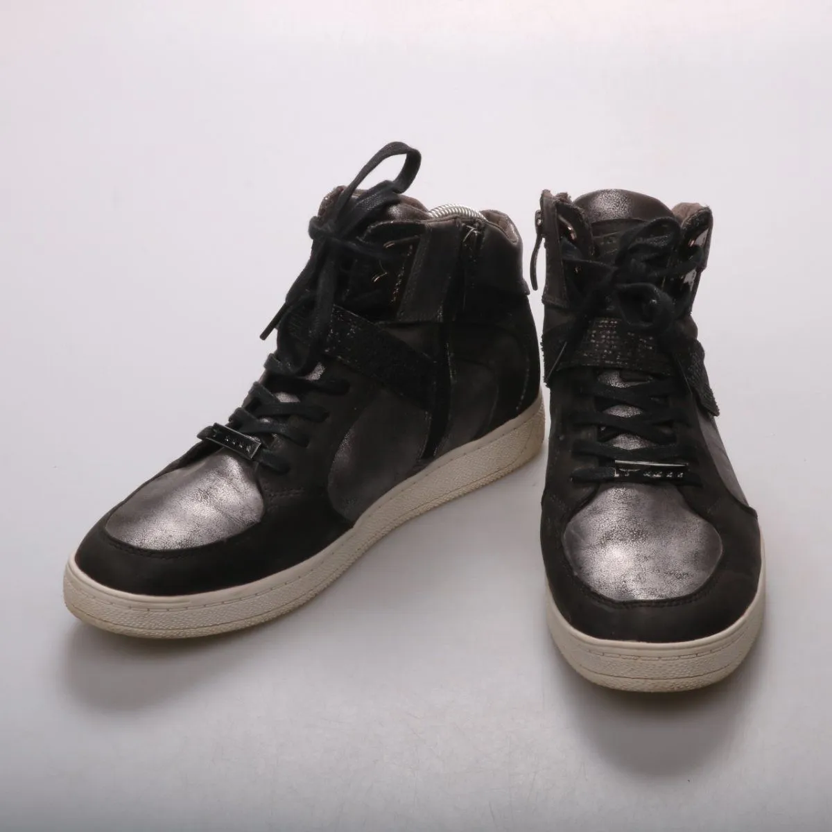 Женские высокие кроссовки Tamaris в чёрно-серебристой расцветке, со шнуровкой и боковой молнией. Подойдут для повседневной носки в городе в демисезон. Молния облегчает надевание и фиксацию на ноге.