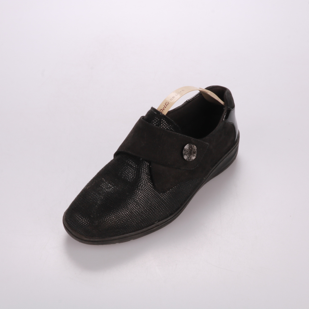 Лоферы Solidus из чёрной кожи/нубука с фактурной отделкой и широким ремешком на подъёме. Подойдут для повседневной носки и офиса в демисезон, хорошо сочетаются с брюками и джинсами. Устойчивая подошва с протектором даёт хорошее сцепление и комфорт при ...