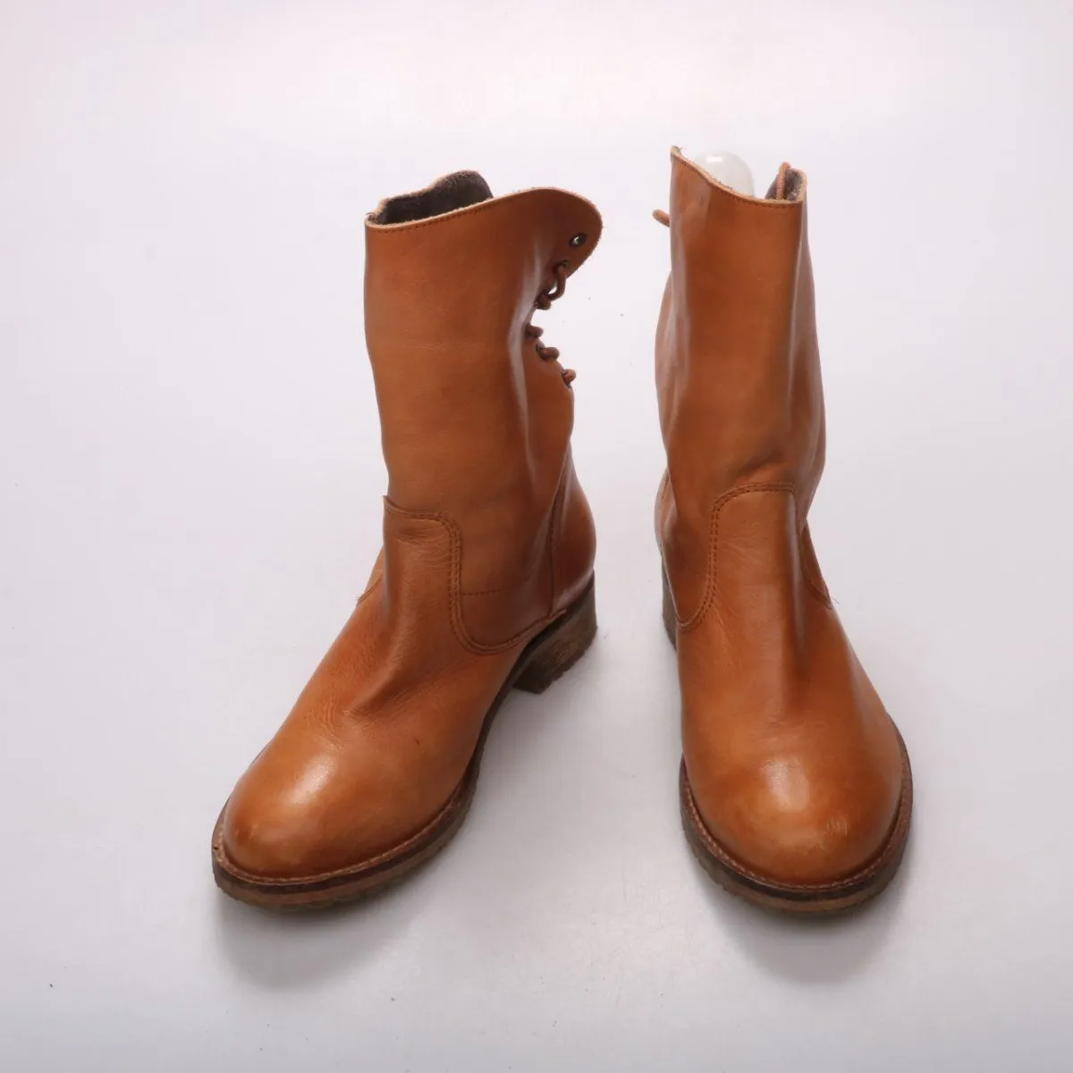 Женские кожаные сапоги 5th Avenue коричневого цвета на низком каблуке, с высокой посадкой до середины икры. Подойдут на осень и весну под джинсы и платья, есть следы носки по заломам кожи и подошве. Натуральная кожа хорошо садится по ноге и долго носится при правильном уходе.