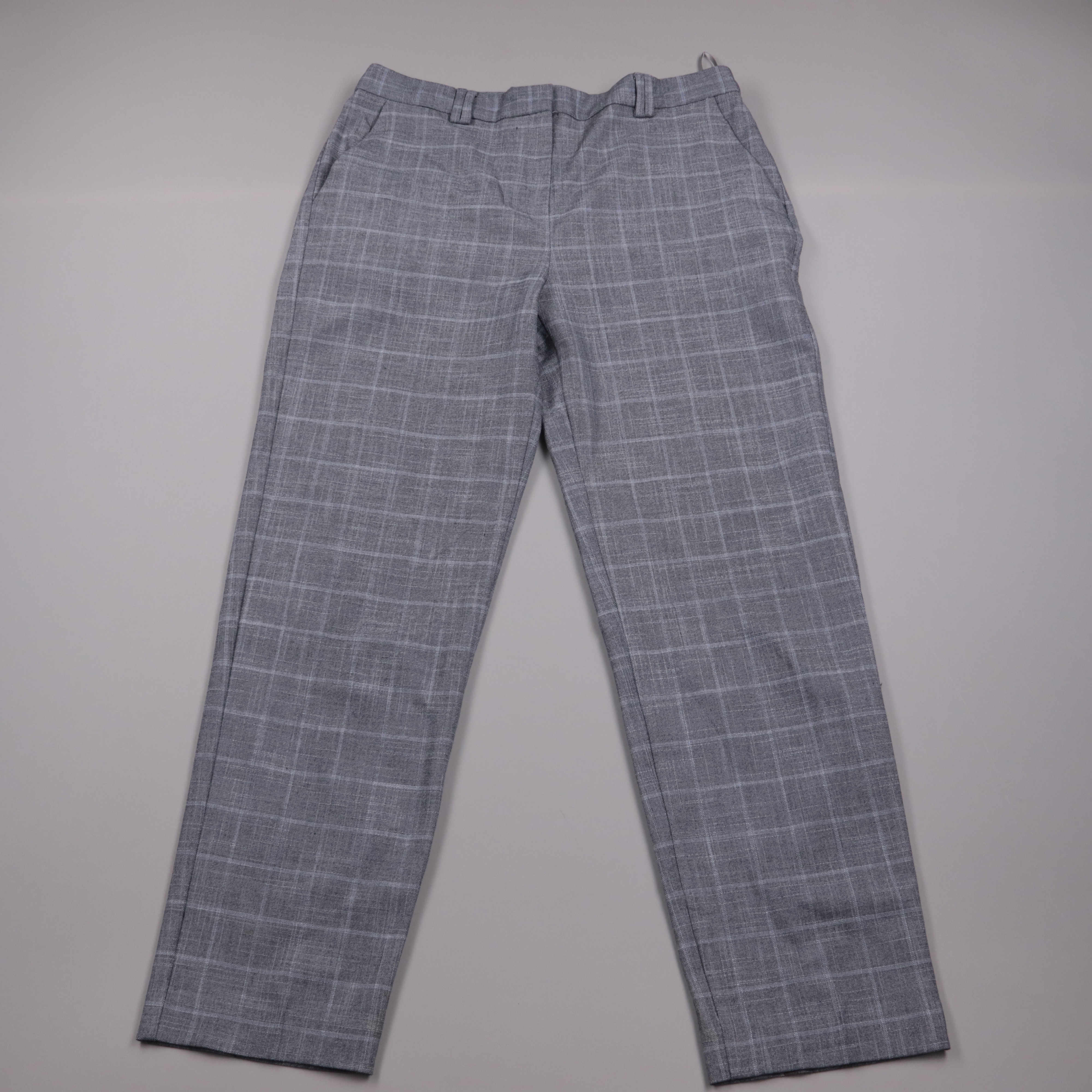 Женские классические брюки M&S серого цвета в клетку, прямого кроя с карманами и шлёвками под ремень. Подойдут для офиса и повседневных образов с рубашкой или джемпером. Ткань с эластаном чуть тянется и комфортно сидит по фигуре.