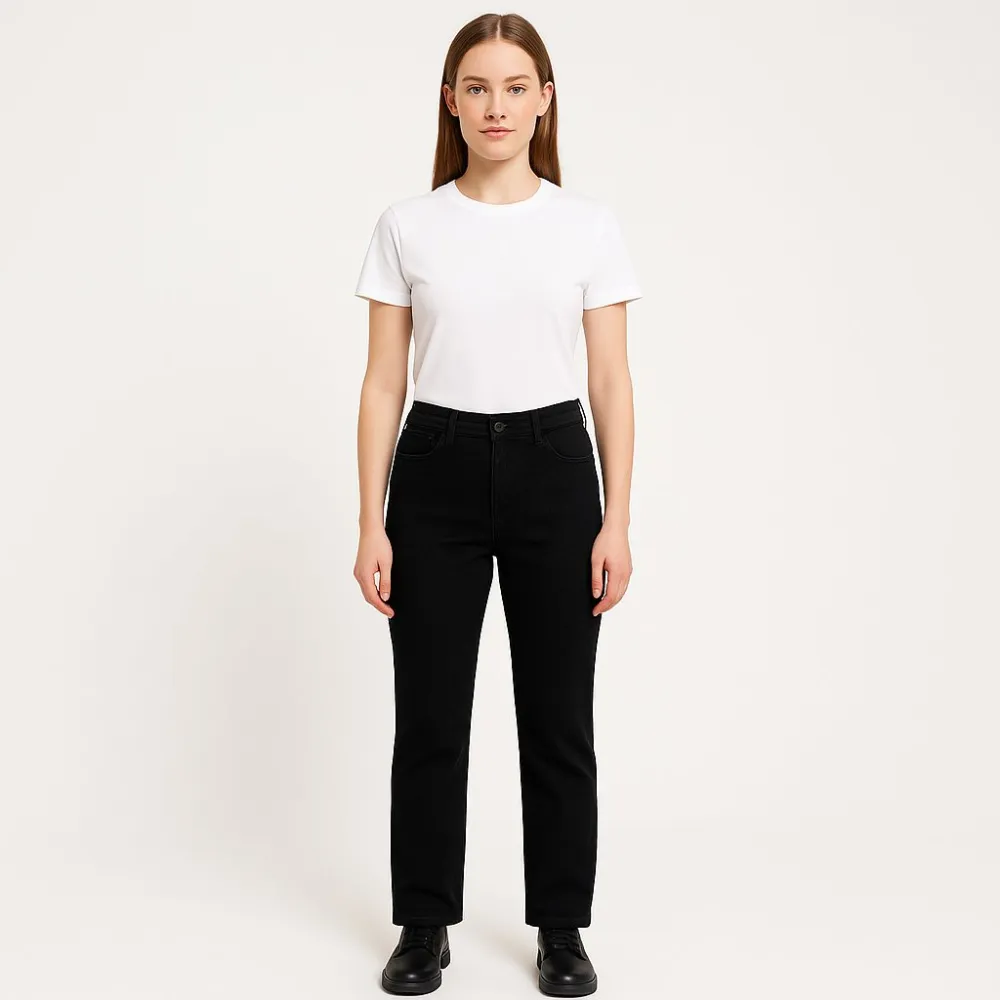 Женские чёрные брюки прямого кроя из плотного эластичного трикотажа. Подойдут для повседневных образов и офиса, хорошо сочетаются с футболками и рубашками. Материал тянется и комфортно садится по фигуре.