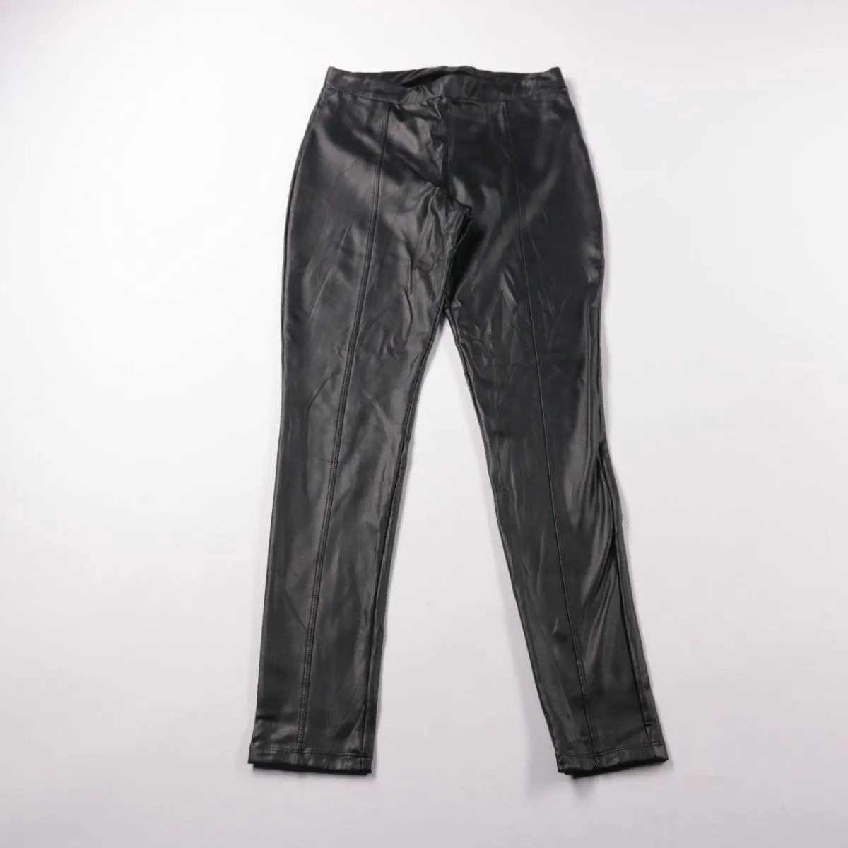 Женские брюки Primark из гладкого материала под кожу, зауженные, с декоративными вертикальными швами. Подойдут для повседневных образов в прохладную погоду и на выход. Материал практичный и легко протирается.