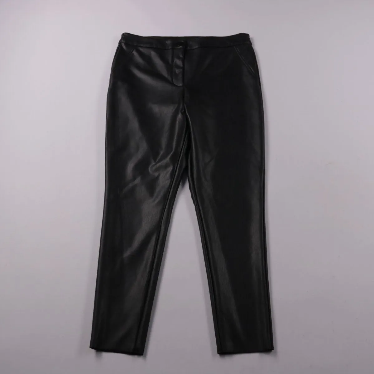 Женские брюки F&F из экокожи, чёрного цвета, прямого облегающего кроя. Подойдут для повседневных образов в прохладную погоду с ботинками или кроссовками. Практичное преимущество — материал легко протирается и не требует сложного ухода.