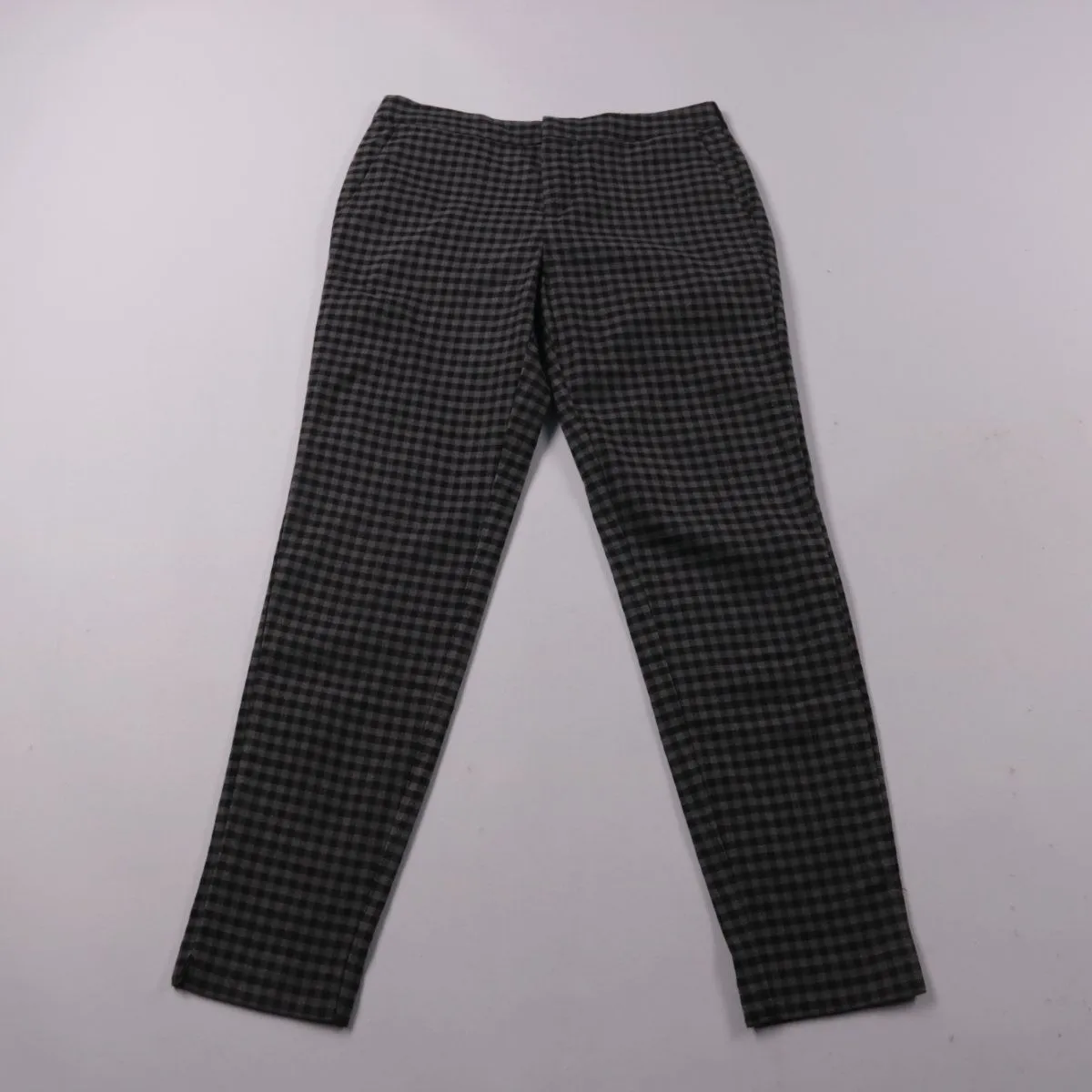Женские зауженные брюки Mohito в серо-чёрную клетку. Подойдут для повседневных образов и офиса, хорошо сочетаются с однотонным верхом. Практичный плюс — принт менее заметно собирает мелкие следы носки.