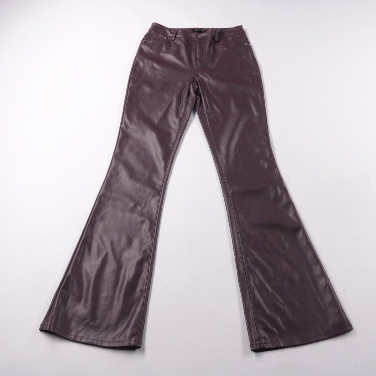 Брюки Lipsy London из экокожи бордового цвета, с застёжкой на молнию и расклешёнными штанинами. Подойдут для повседневных образов в прохладную погоду и на выход. Практичное преимущество — материал легко протирается и не требует сложного ухода.
