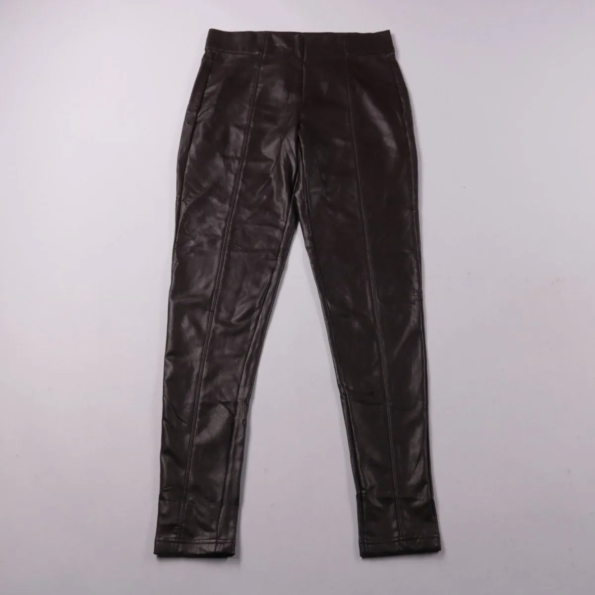 Женские брюки M&S из ткани с полиуретановым покрытием под кожу, зауженного силуэта. Подойдут для повседневных образов в прохладную погоду и на выход. Материал слегка тянется и легко очищается влажной салфеткой.