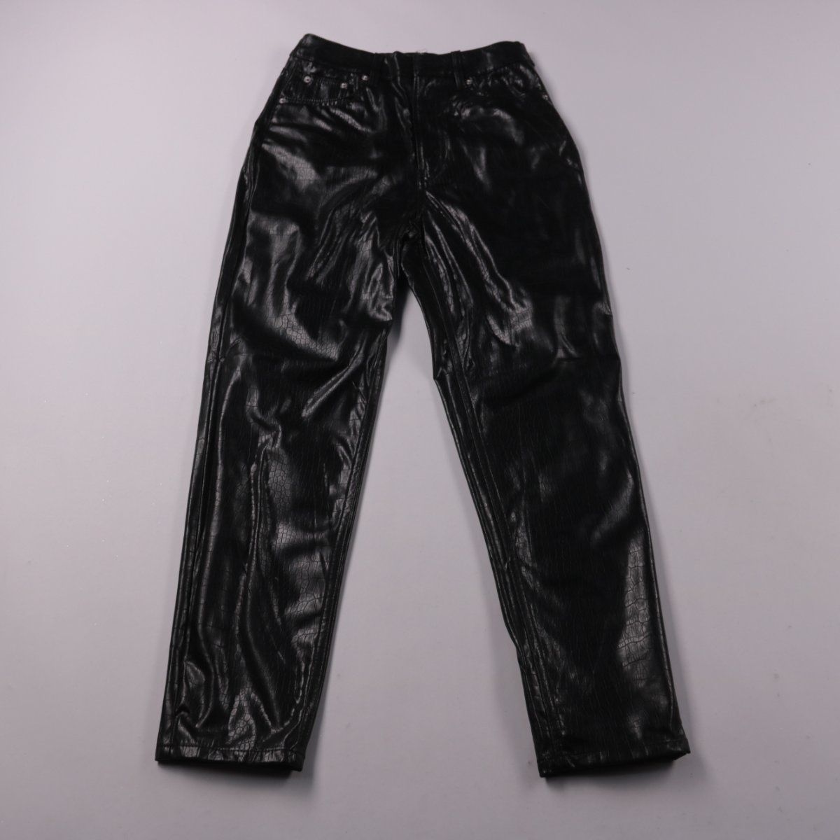 Женские зауженные брюки H&M Divided из материала с глянцевым покрытием под кожу. Подойдут для повседневных городских образов в прохладную погоду и на вечерние выходы. Практичное преимущество — плотная ткань с покрытием меньше продувается и легко протирается от загрязнений.