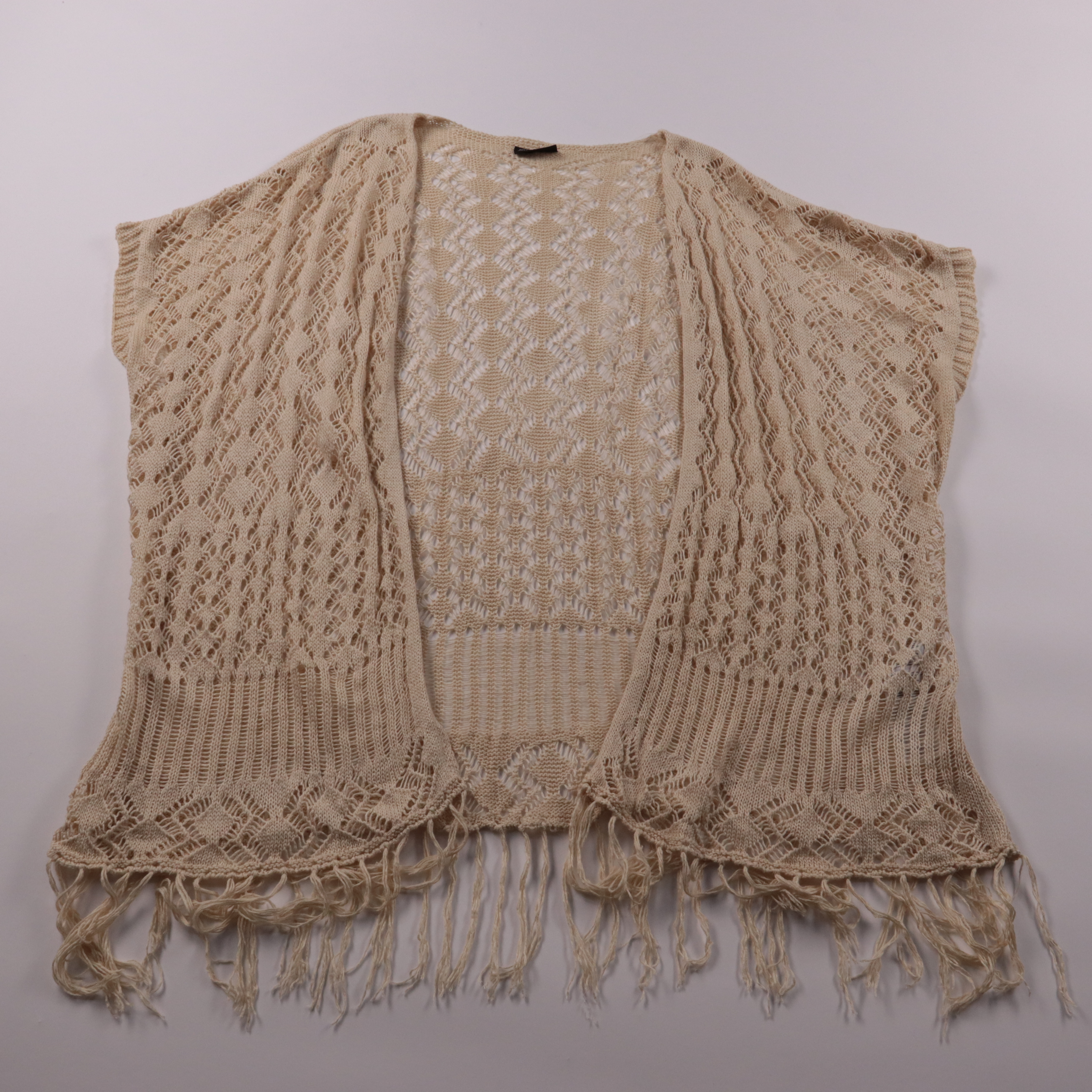 Ажурный вязаный жилет Janina бежевого цвета с открытым передом и бахромой по низу. Подойдёт для летних образов и отдыха, хорошо смотрится поверх топа или платья. Лёгкий материал почти не мнётся и быстро сохнет после стирки.