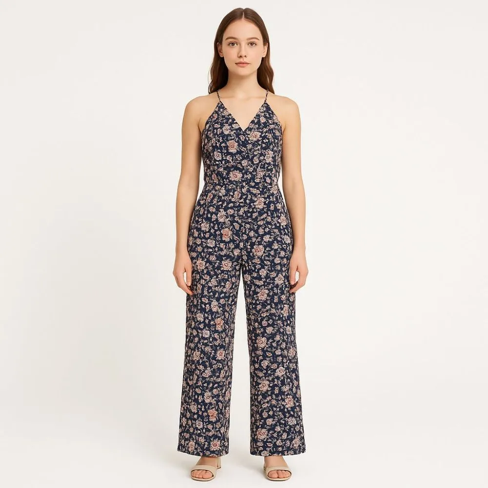 Женский комбинезон на тонких бретелях с V-образным вырезом и цветочным принтом на тёмно-синем фоне. Подойдёт для летних прогулок и отдыха, хорошо смотрится с сандалиями или кедами. Лёгкий крой и широкие штанины дают свободу движений и комфорт в жару.
