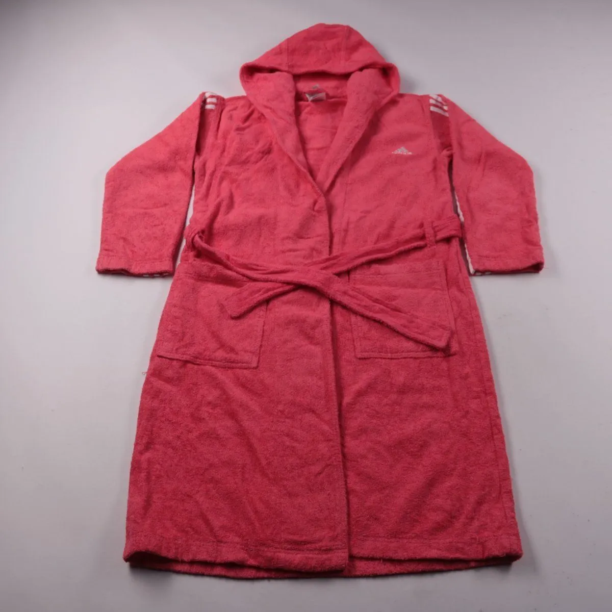 Махровый халат Adidas розового цвета с капюшоном, поясом и накладными карманами. Подойдёт для дома, бассейна или после душа. Хлопковая ткань хорошо впитывает влагу и комфортна к телу.