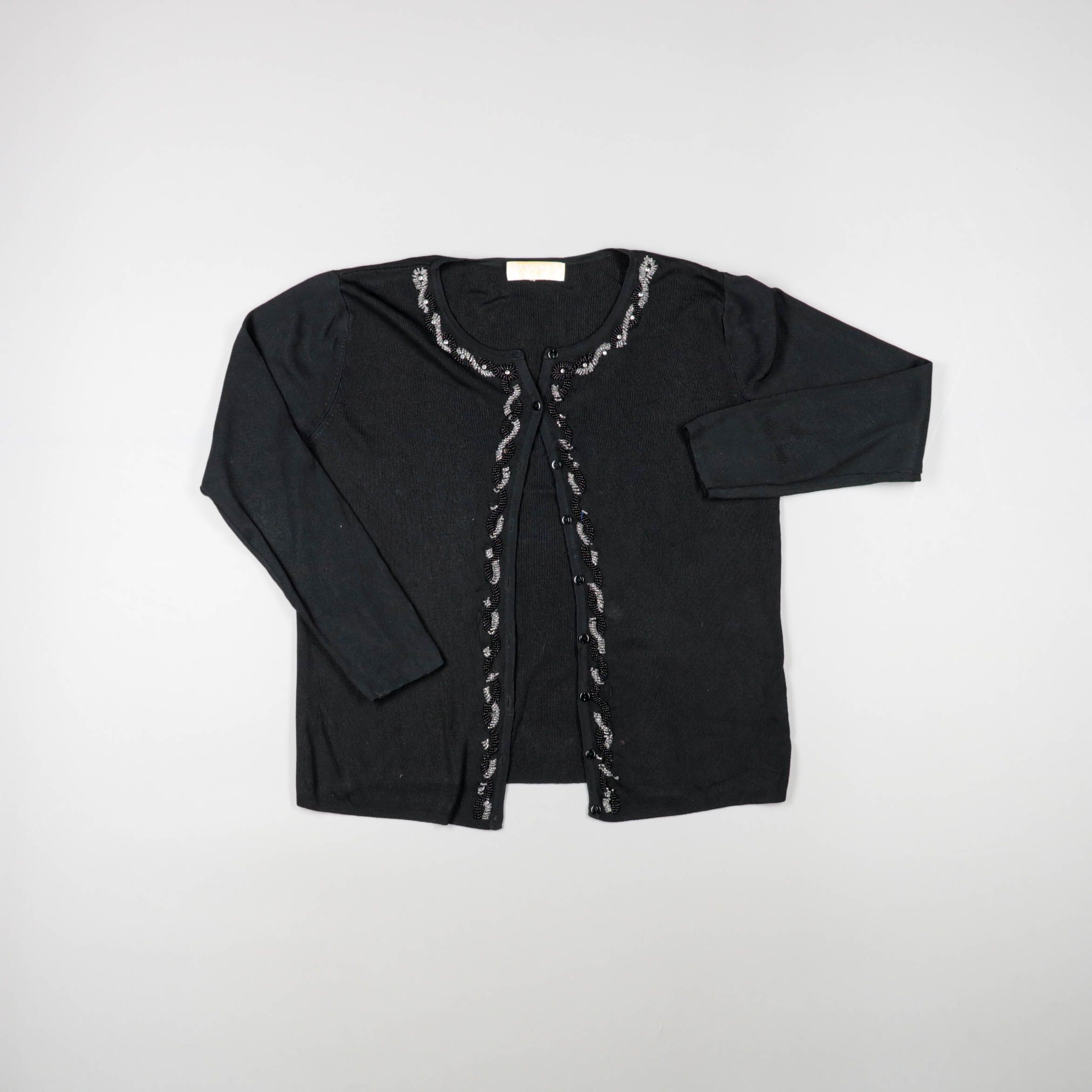 Женский чёрный кардиган с декоративной отделкой по горловине и планке застёжки. Подойдёт для офиса и повседневных образов, легко сочетать с платьем, джинсами или юбкой. Удобно носить как второй слой — есть пуговицы, можно регулировать посадку по фигуре.