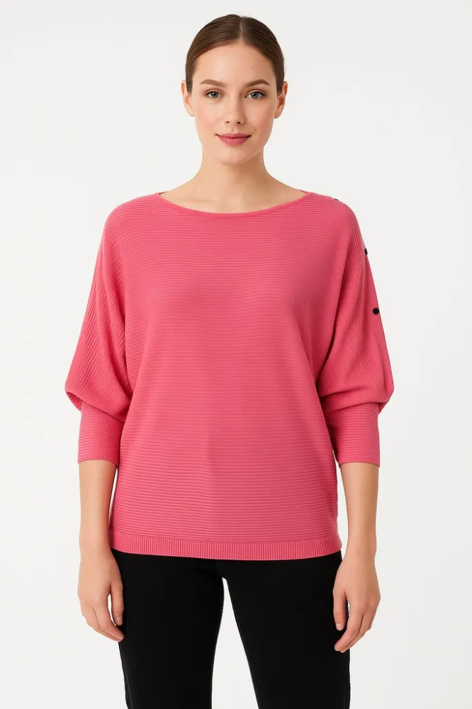 Женский джемпер свободного кроя с рукавом 3/4 и горизонтальной фактурной вязкой. Подойдёт для повседневных образов и офиса в демисезон, хорошо смотрится с брюками и джинсами. Мягкий трикотаж комфортно сидит и не сковывает движения.