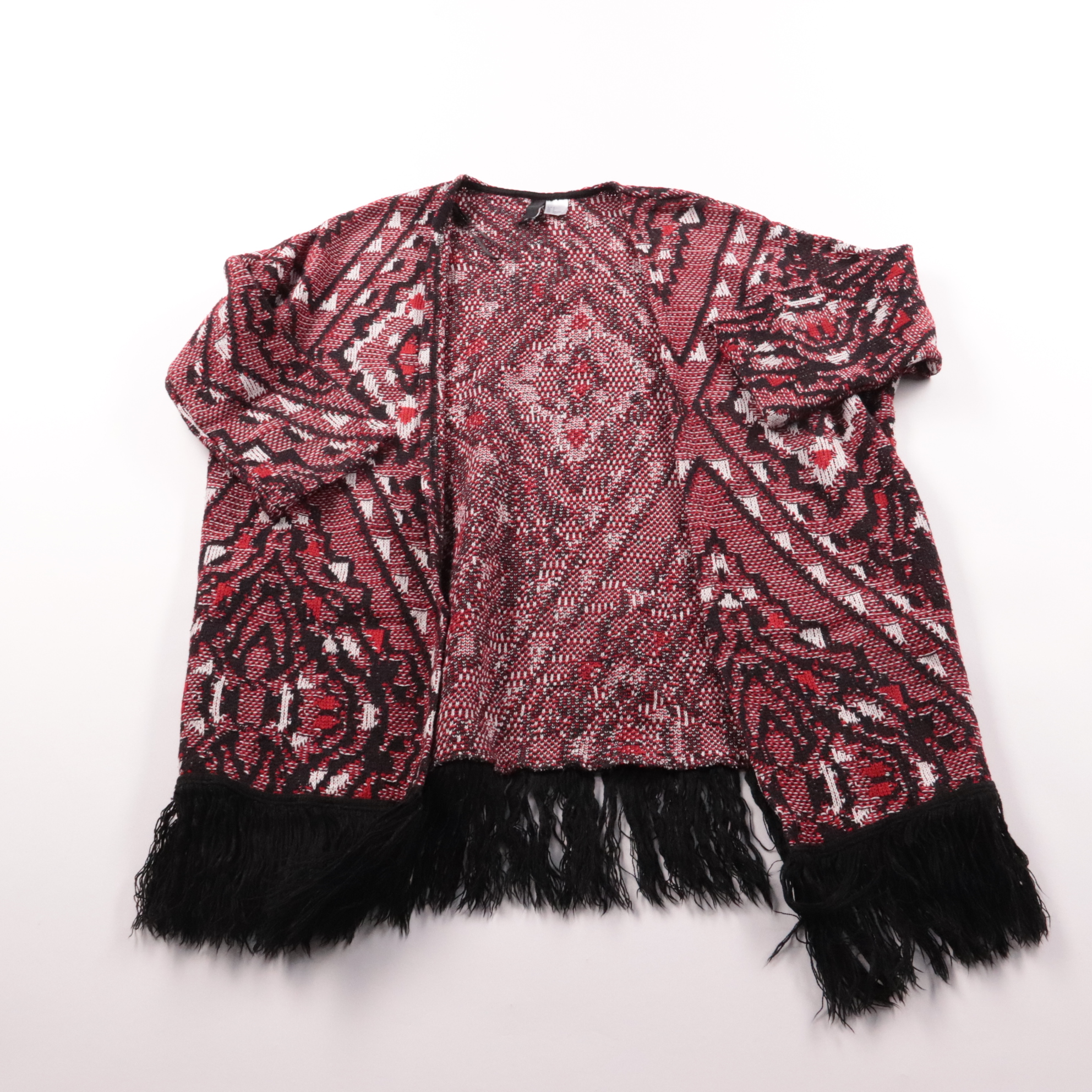 Вязаный кардиган H&M с ярким жаккардовым узором и длинной бахромой по низу. Подойдёт для прохладной погоды и многослойных образов с джинсами или платьем. Мягкая пряжа приятна к телу и не требует сложного ухода.