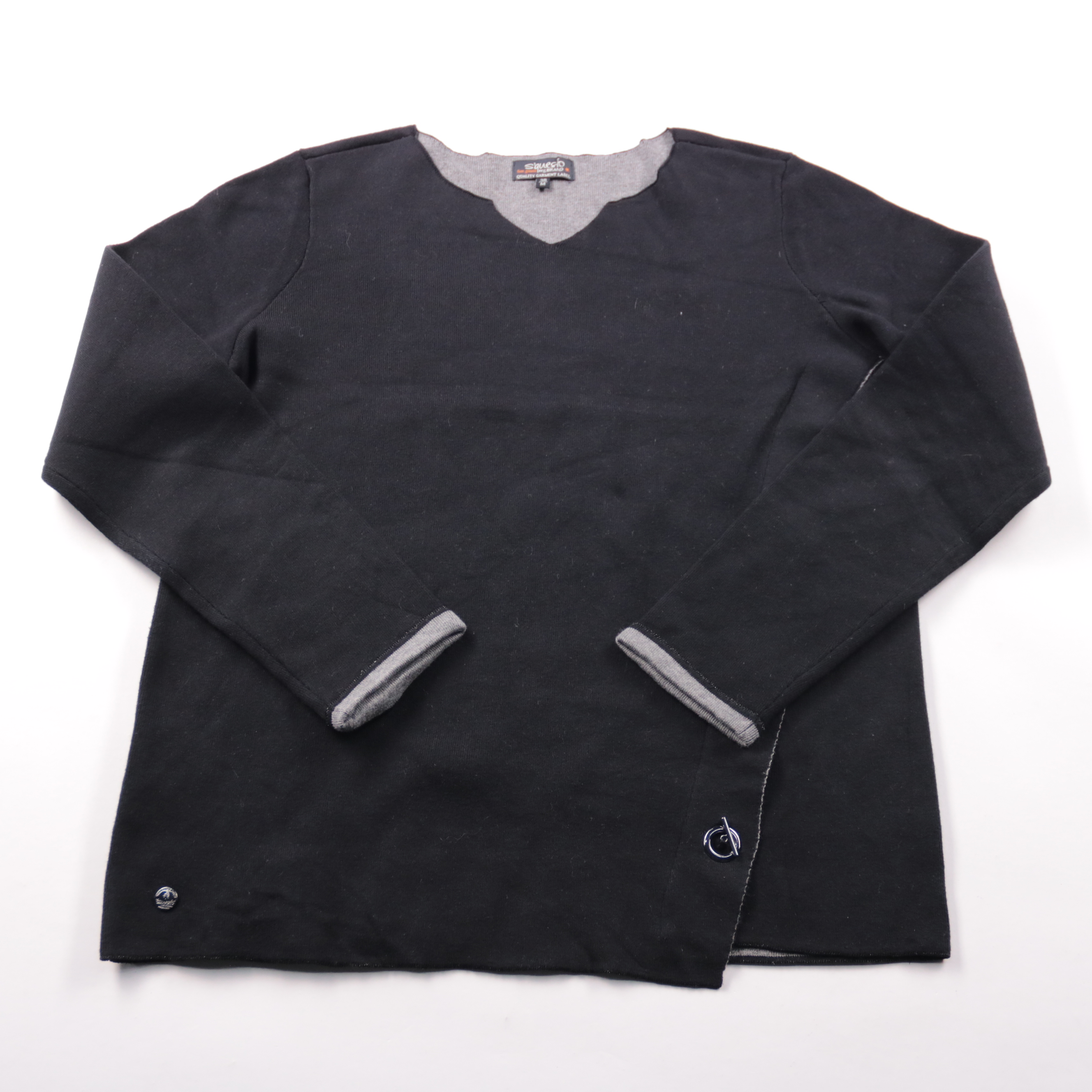 Женский джемпер S'questo чёрного цвета с контрастной серой отделкой по вырезу и манжетам. Подойдёт для повседневных образов в офис и на прогулки в прохладную погоду. Трикотаж на основе хлопка хорошо дышит и комфортен в носке.