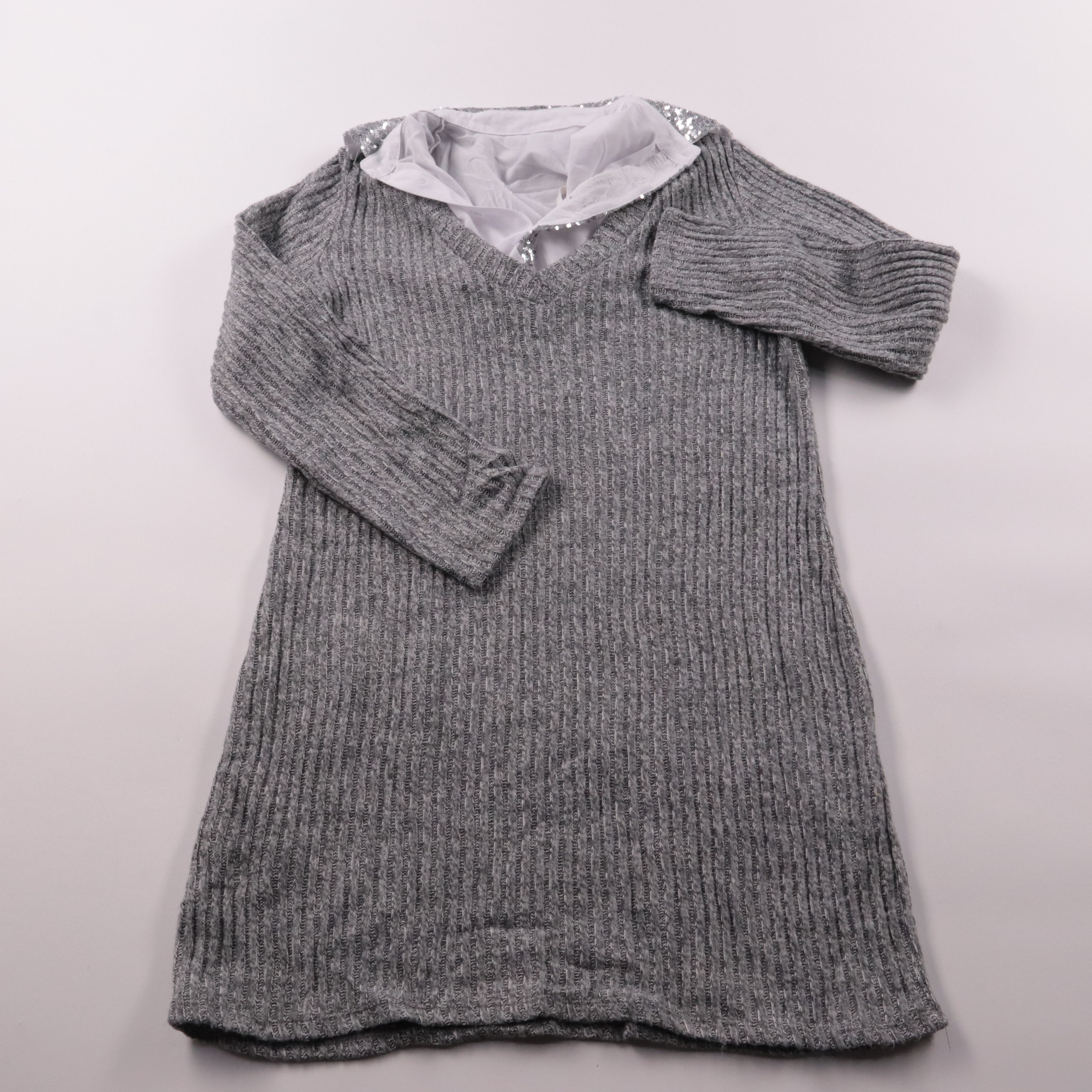 Серая трикотажная кофта в рубчик с V-образным вырезом и вставкой-имитацией белой рубашки у горловины, со стразами по краю. Подойдёт для офиса и повседневных образов в прохладную погоду. Практична тем, что хорошо тянется и почти не мнётся.