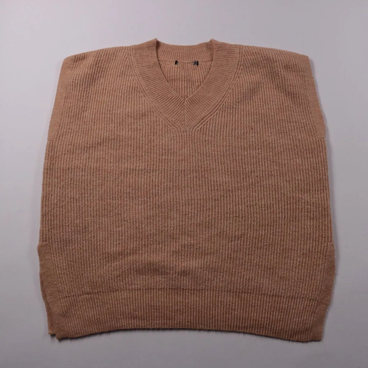 Вязаный жилет с V‑образным вырезом в бежевом цвете, бренд на бирке не читается. Подойдёт для повседневных образов поверх рубашки или лонгслива в прохладную погоду. Практичен тем, что легко сочетается с базовыми вещами и не стесняет движения.